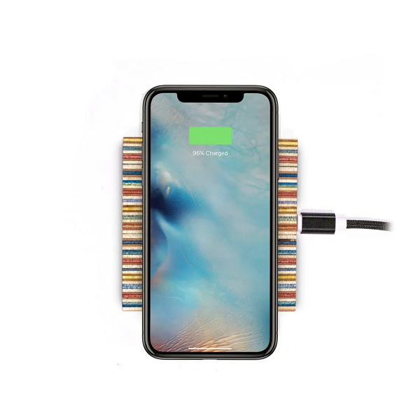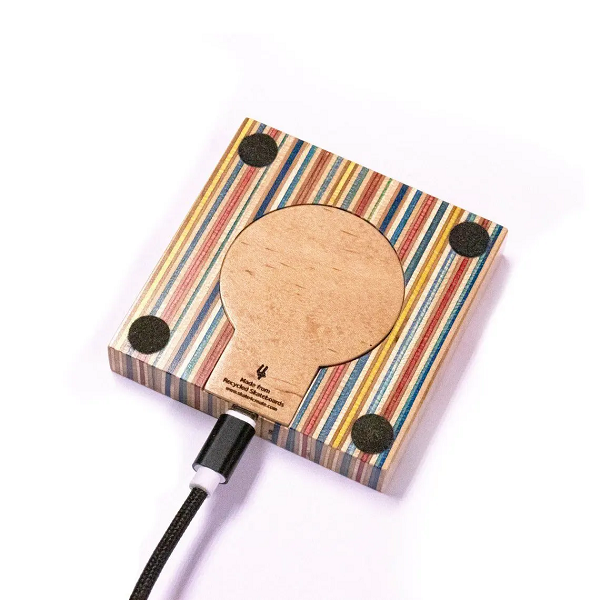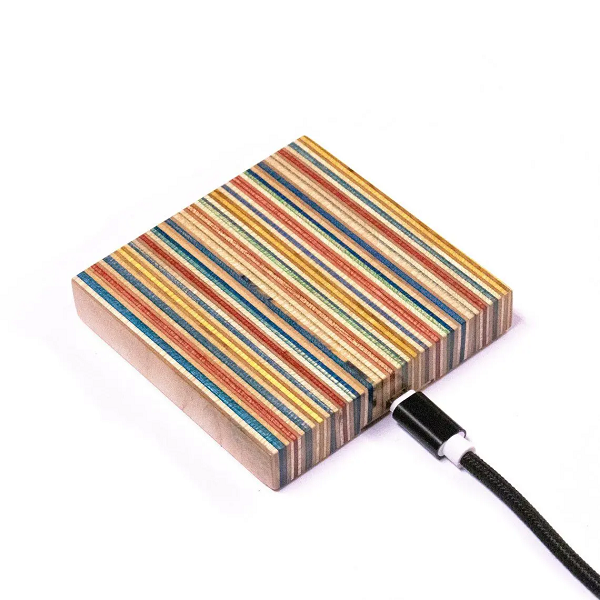 Fabriquée à la main avec passion à partir de véritables planches à roulettes recyclées en Érable Canadien. Notre station de recharge pour téléphones fonctionne avec tous les appareils compatibles Qi. Elle est composée de 8 à 9 couleurs différentes de planches à roulettes recyclées qui sont collées ensemble pour créer un motif coloré continu. Intelligemment conçue, elle fonctionne avec la plupart des coques jusqu'à 3 mm d'épaisseur. Antidérapante grâce à son pied en tissus noir, elle est Certifiée CE, FCC, ROHS.